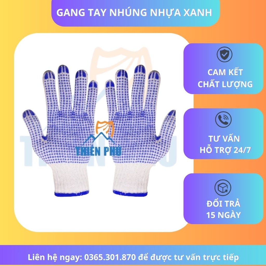* Chất liệu: 100% vải sợi cotton nhúng nhựa xanh dạng hạt lòng bàn tay